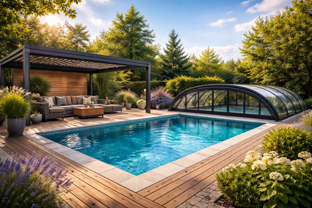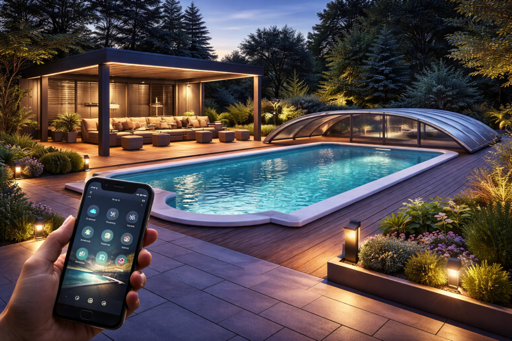 Inteligentny basen i taras to przyszłość nowoczesnych ogrodów – miejsce, które samo dostosowuje się do pogody, pory dnia i stylu życia domowników.